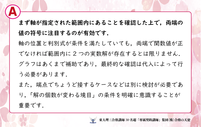 なのであまり心配しなくても良いですが、グラフの概形を考えられるなら、 一度確認してみるとより盤石ではあります。