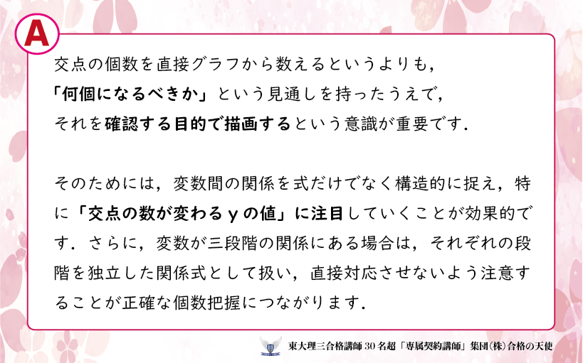 グラフの交点の個数から解の数を求めるような問題で、どのようにして交点の個数を判断すればよいですか